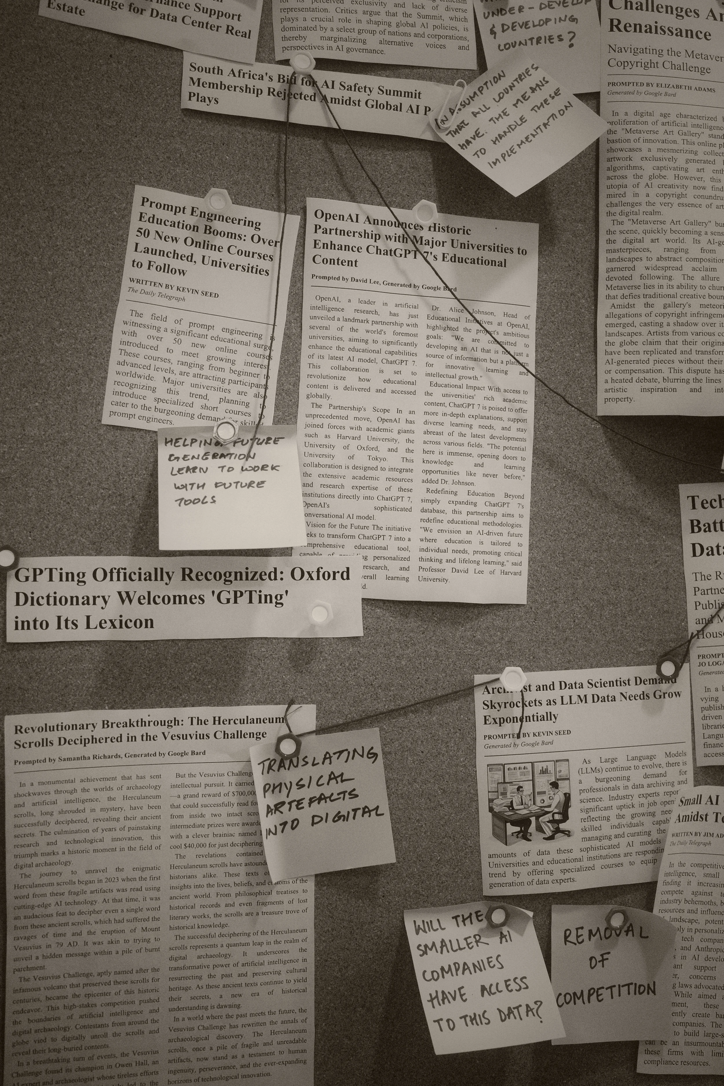 Fictional elements were designed to feel continuous with real media artefacts, emphasising familiarity over rupture. The intention was not to deceive, but to create a space where the boundaries between policy, reporting, and speculation remain unstable. The work resists resolution, holding open the uncertainty that public-facing AI discourse often smooths over.